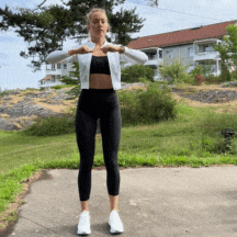 - Startposisjon: Stå oppreist med føttene plassert i skulderbreddes avstand. Hold armene ut til sidene, parallelt med gulvet, eller plasser hendene på hoftene.